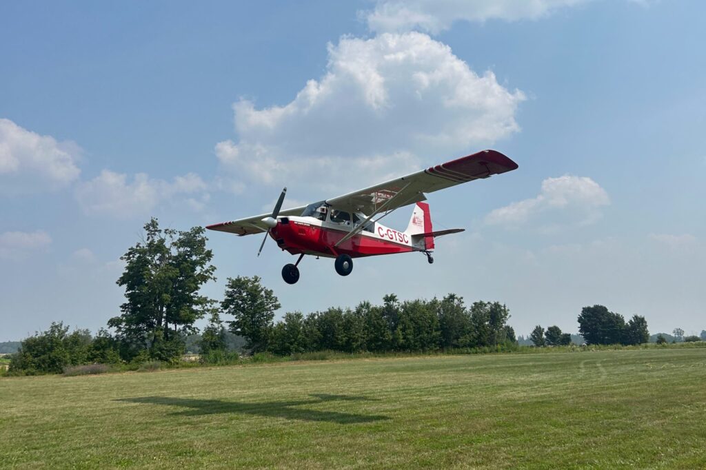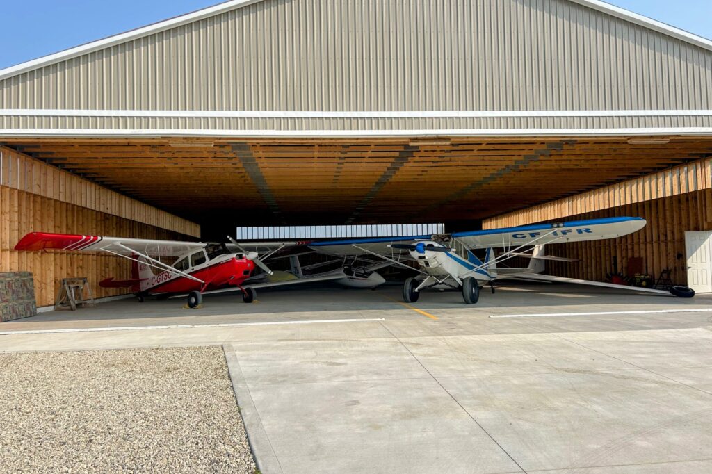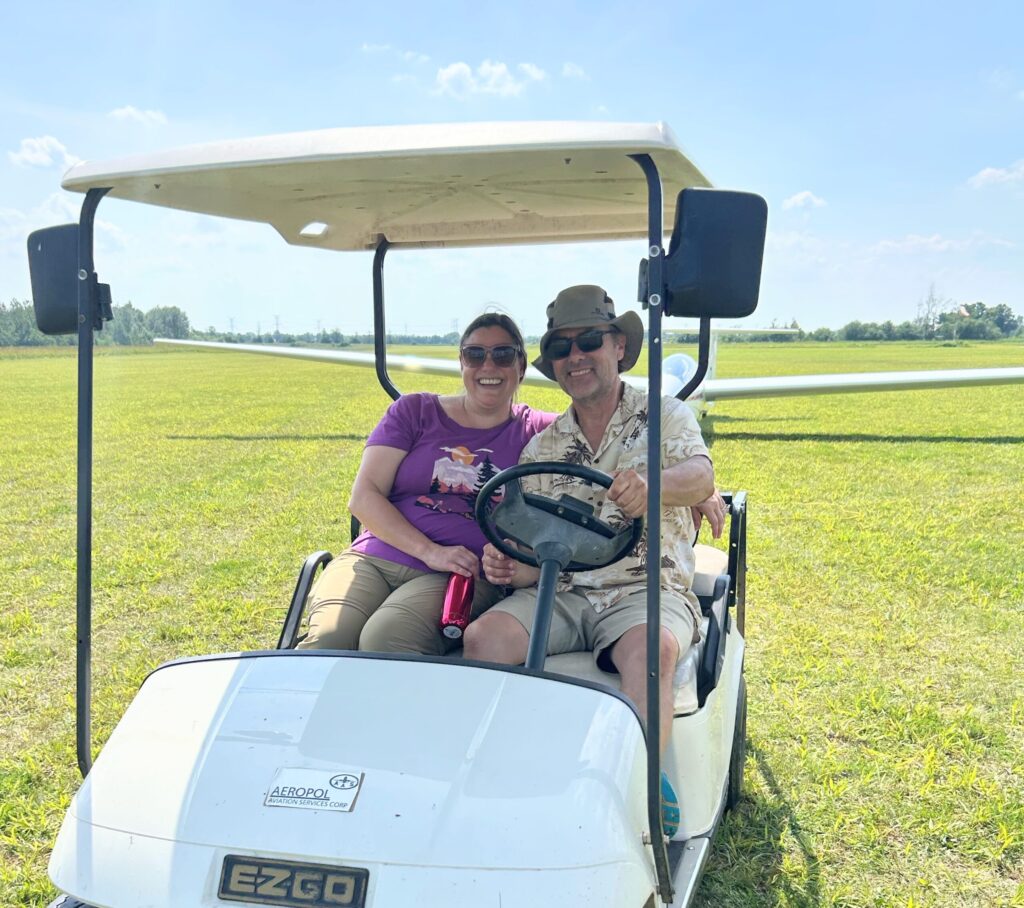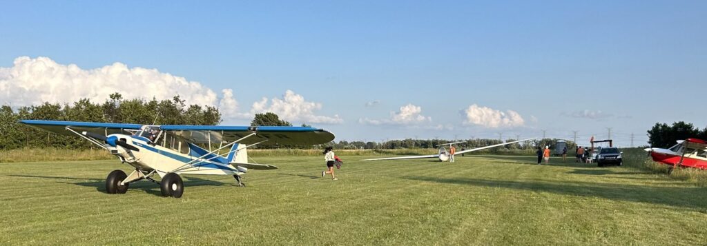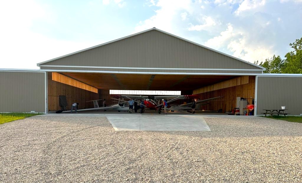Charles Petersen, Chair of Youth Flight Canada Education Fund, presents a cheque for $60,000 to Dave Bluhm, President of Toronto Soaring Club, towards the new hangar that will be constructed this fall. It will shelter 5 gliders, including ZH, the YFC K-21.